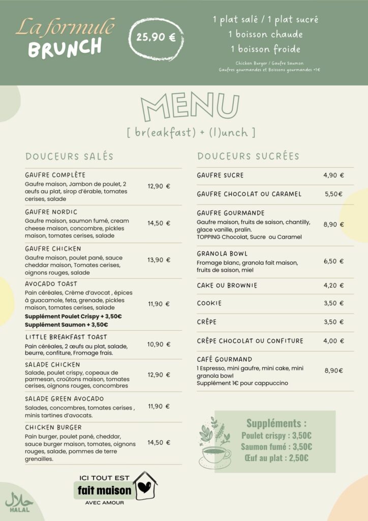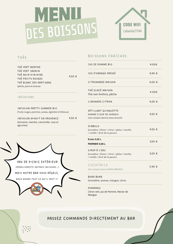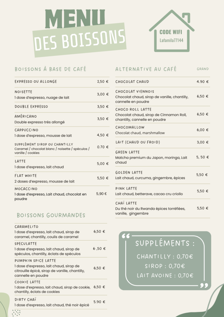 Accompagnez votre repas de cafés de spécialité, jus frais et boissons gourmandes pour une pause brunch réconfortante.